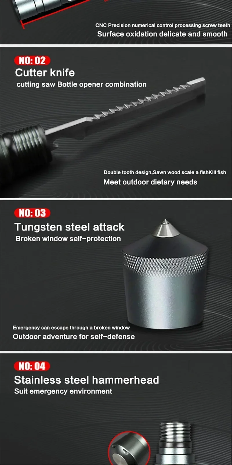 (2)Premium quality all-in-one walking stick,main accessories ( According to the order image) CNC machined from aluminum alloy 6061-T6, tools are made from stainless steel 304; worth every penny spent on this outdoor EDC hiking gear. NOTE: our walking sticks have 3 must-have outdoor-tools, others might not have tools.